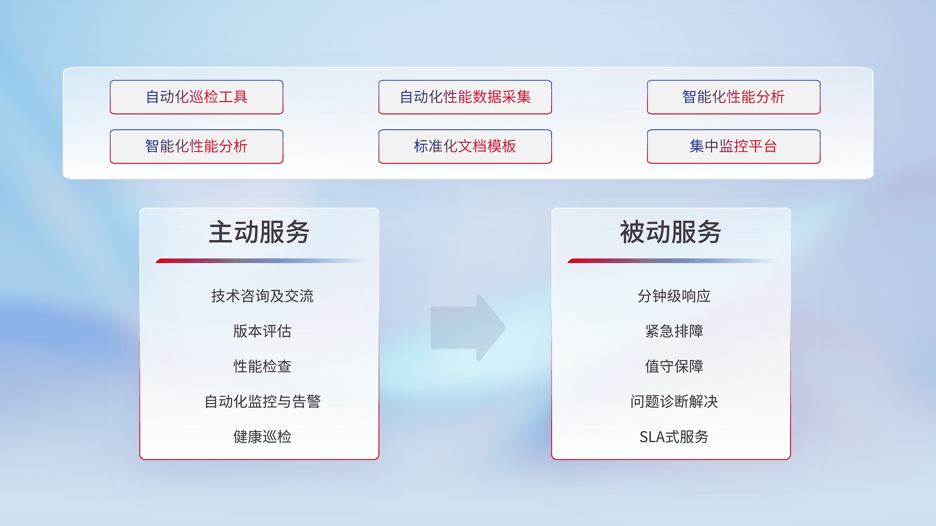 智能化工具和标准化文档,,保障服务质量,,提供主动服务(包含技术咨询、、、版本评估、、、、性能检查、、自动化监控与告警、、、健康巡检)和被动服务包含(分钟级响应、、、、紧急排障、、、值守保障、、、问题诊断解决、、、SLA服务)。。